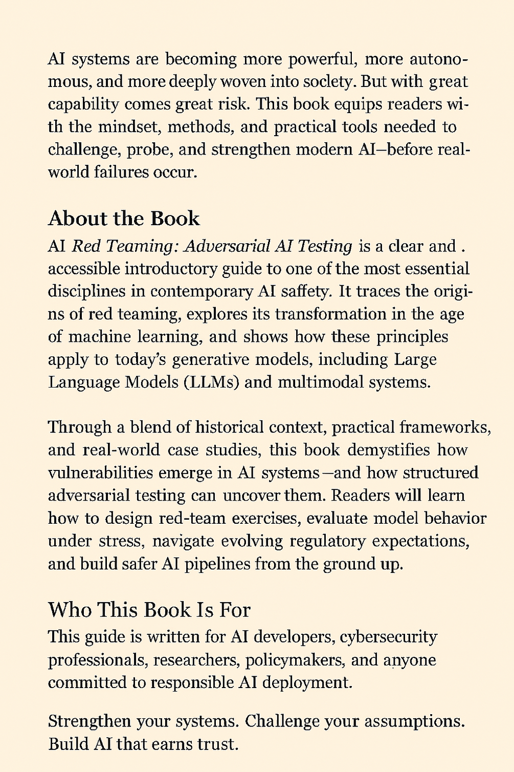 This guide is written for AI developers, cybersecurity professionals, researchers, policymakers, and anyone committed to responsible AI deployment. Whether you’re implementing red‑team workflows in industry, conducting academic research on AI safety, or shaping governance frameworks, this book provides the foundational knowledge and practical insight needed to contribute meaningfully to the field.